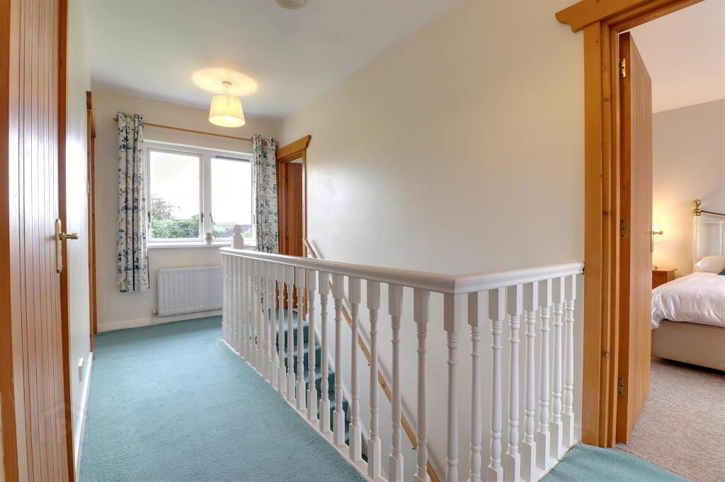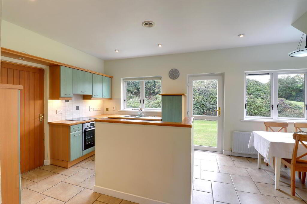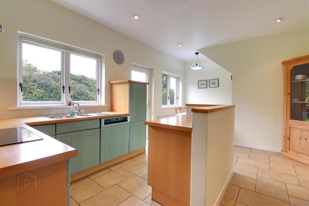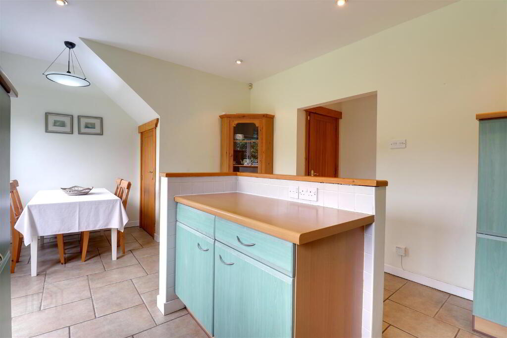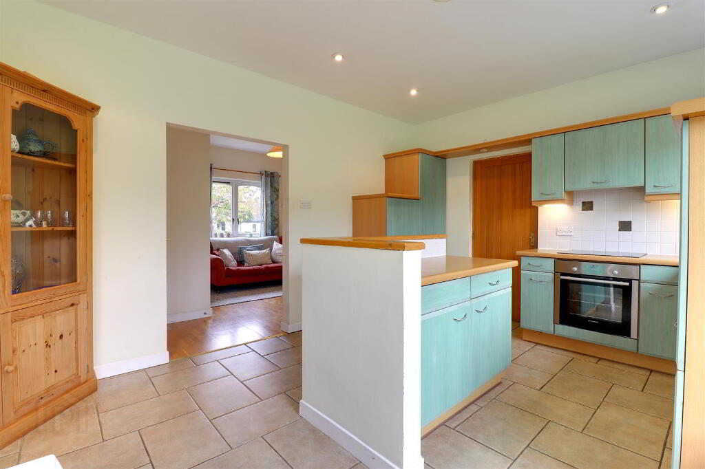 At widest points. Range of high and low level units in green finish with wood effect worktops. 1 1/2 bowl stainless steel sink with mixer tap. Integrated oven, hob & extractor hood. Integrated dish washer. Central island. Door to rear garden. Tiled floor and part tiled walls. Recessed spotlights. Access to integral garage.