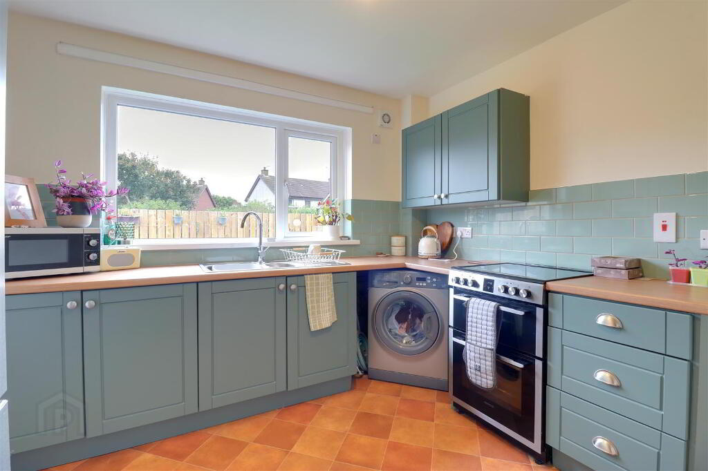 Range fo modern high and low level units in "Shaker style" finish with wood effect worktops. 1 1/2 bowl stainless steel sink with mixer tap. Part tiled walls.
