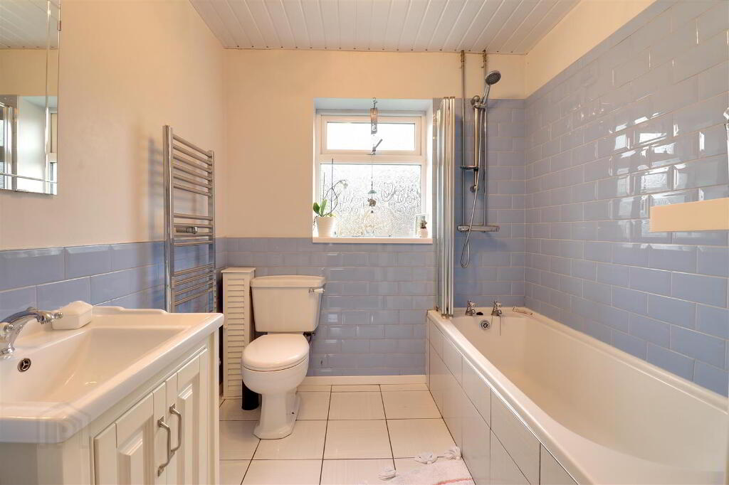 Modern white suite comprising panel bath, with thermostatic shower & glass shower screen, WC & wash hand basin with vanity unit. Tiled floor and part tiled walls. Chrome heated towel rail. Extractor fan.
