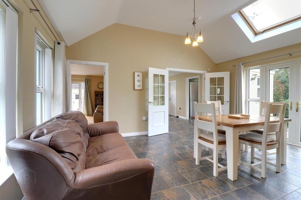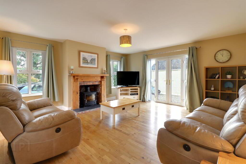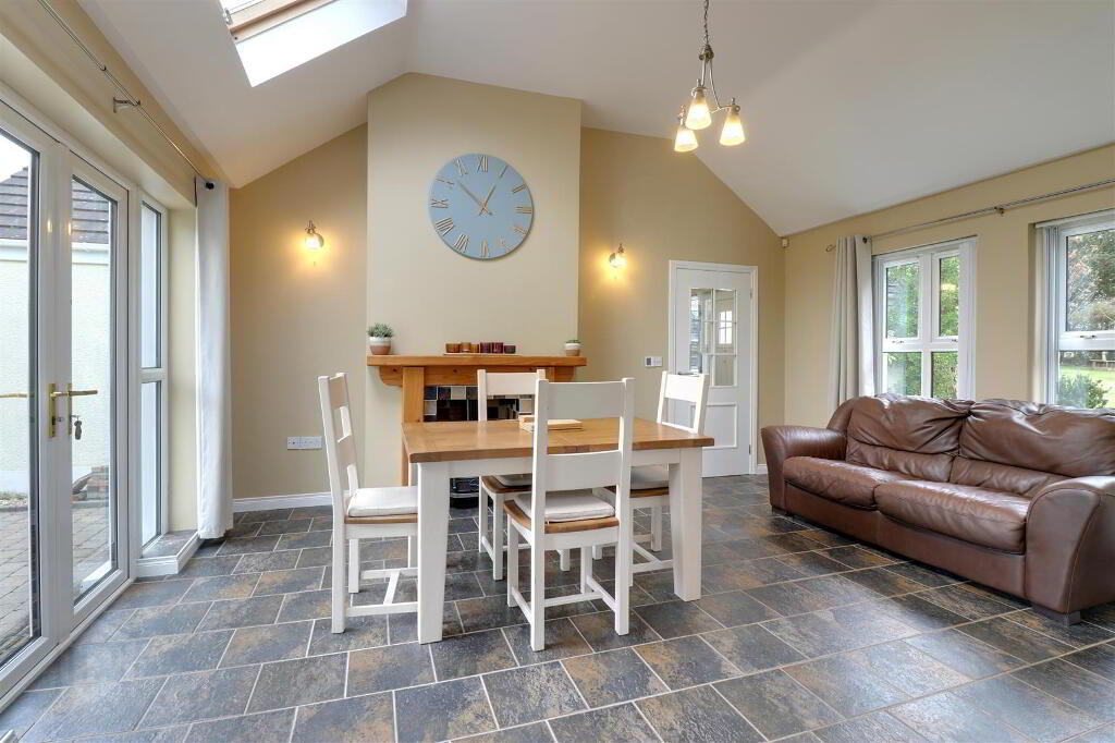 Vaulted ceiling with Velux window. Tiled floor. uPVC patio doors to rear garden. Multi fuel stove with tiled surround and wooden mantel. Part glazed French doors to kitchen.