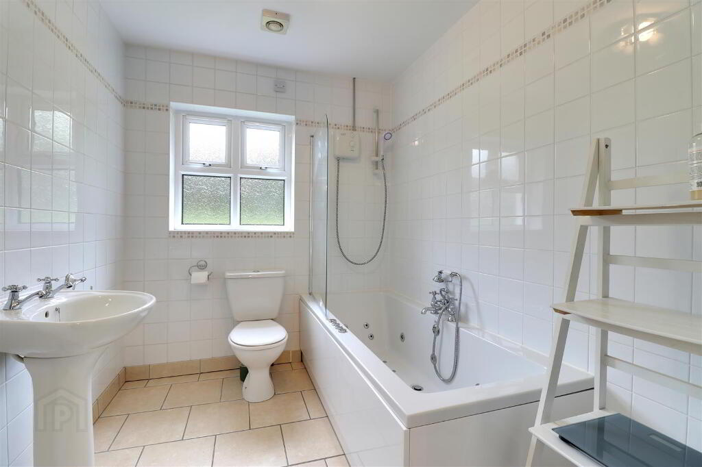 White suite comprising "Whirlpool" bath with Triton electric shower over, WC & wash hand basin. Fully tiled walls and floor. Extractor fan.