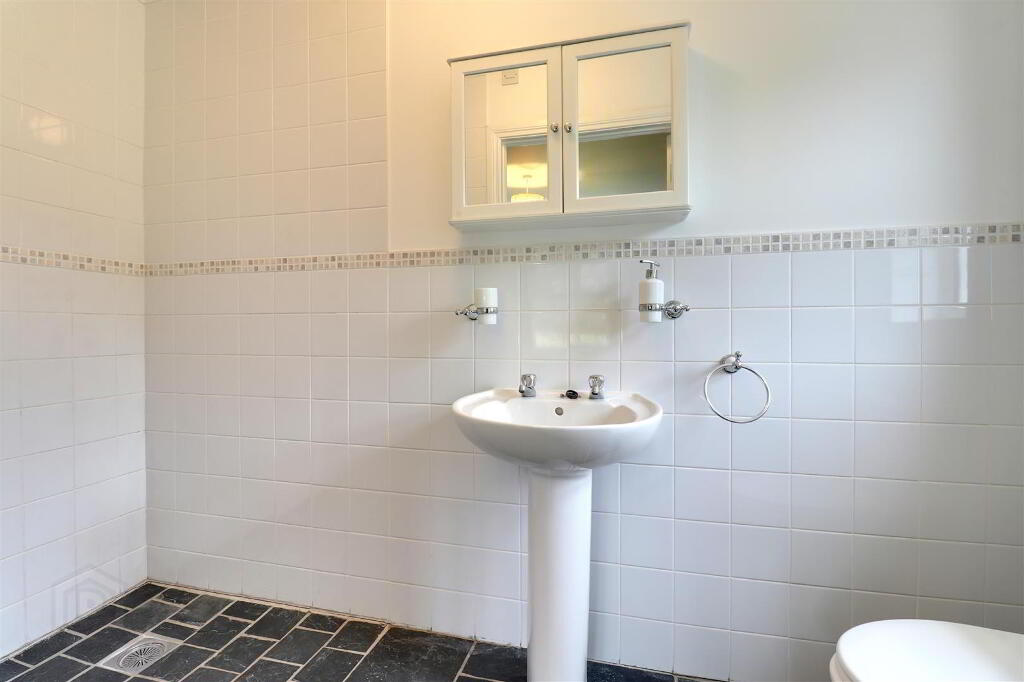 Double shower cubicle with Triton electric shower. White WC & wash hand basin. Fully tiled walls and floor. Chrome heated towel rail. Recessed spotlights. Extractor hood.