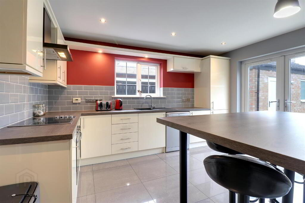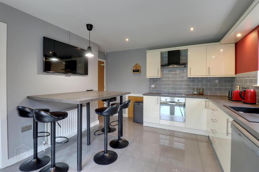 Range of modern high and low level units in gloss finish with wood effect worktops and breakfast bar. Composite sink with mixer tap. Integrated oven, hob & extractor hood. Integrated fridge freezer. Plumbed for dish washer. Tiled floor and part tiled walls. Recessed spotlights. uPVC double glazed patio doors to rear garden.