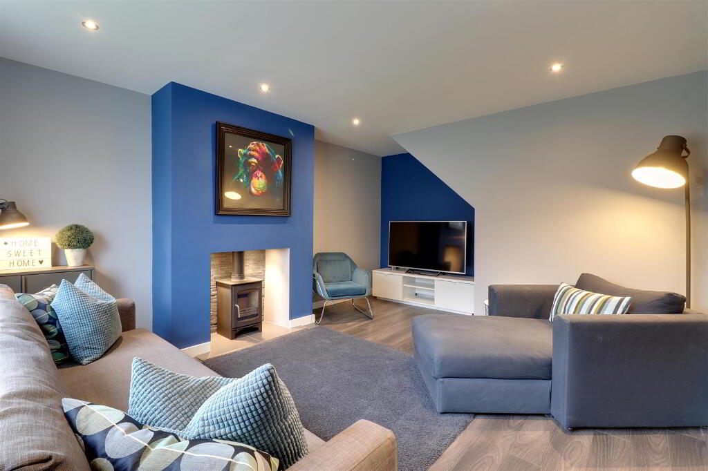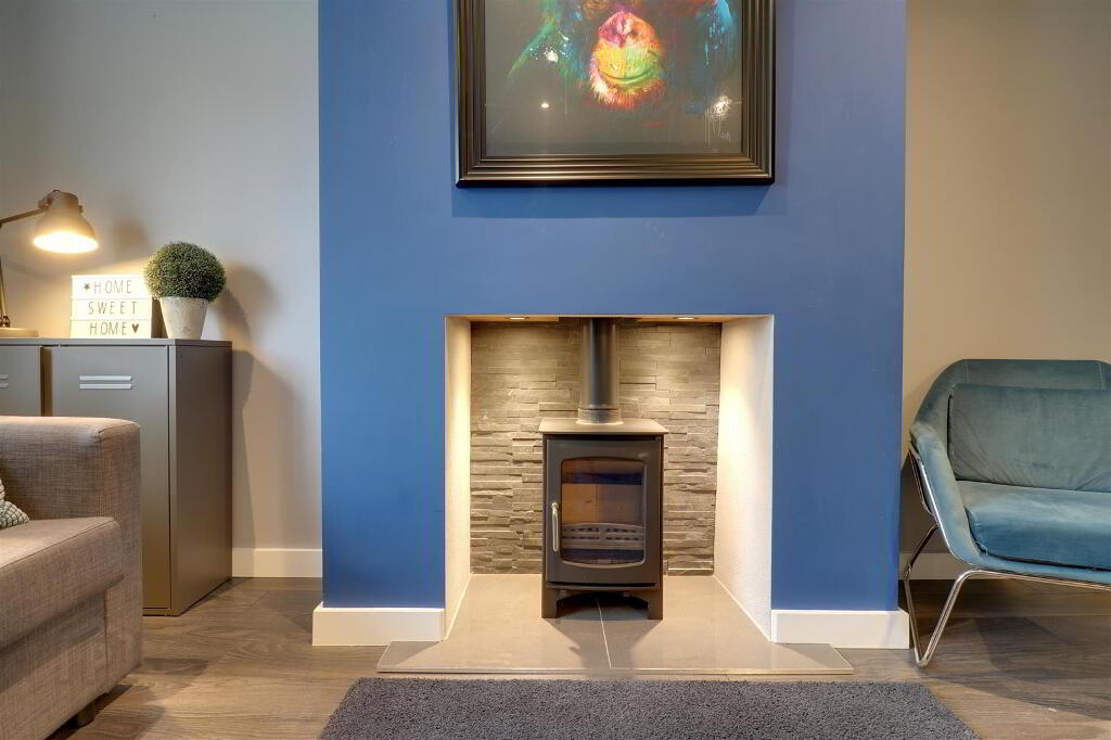 At widest points. Wood effect laminate flooring. Feature multi fuel stove with tiled hearth and feature lighting. Recessed spotlights.
