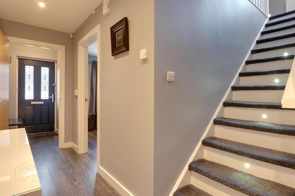 Wood effect laminate flooring. Stairs to first floor landing with decorative foot lights.