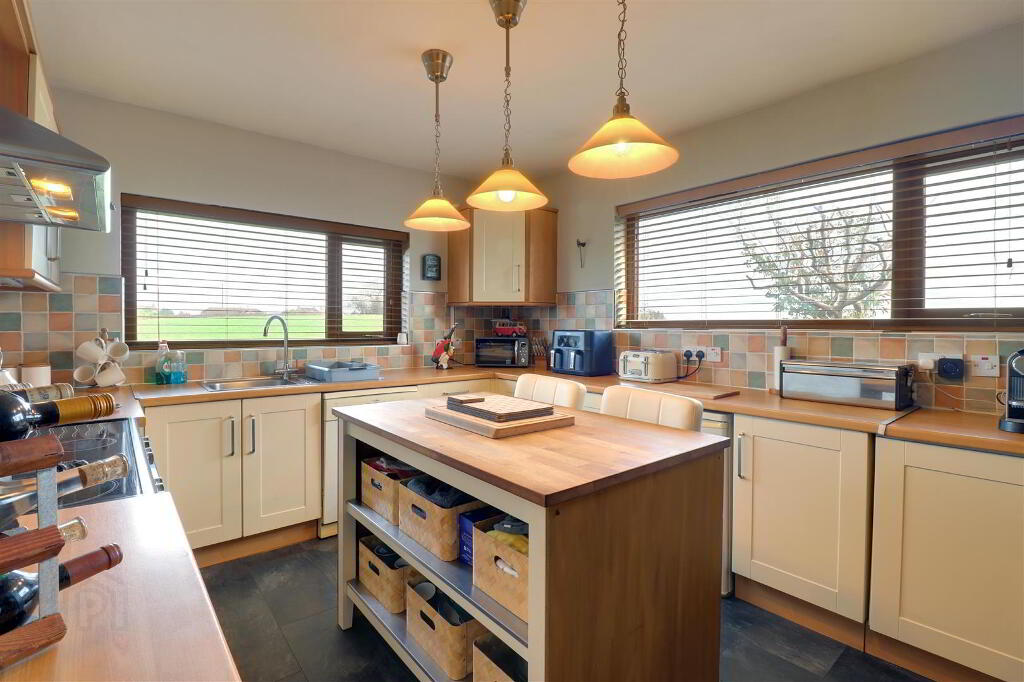 At widest points. Generous range of high and low level units in Shaker style with wood effect worktop and central island. Stainles steel sink with mixer tap. Integrated stainless steel extractor hood. Tile effect laminate flooring. Part tiled walls. Part glazed door to rear lobby and central hallway.