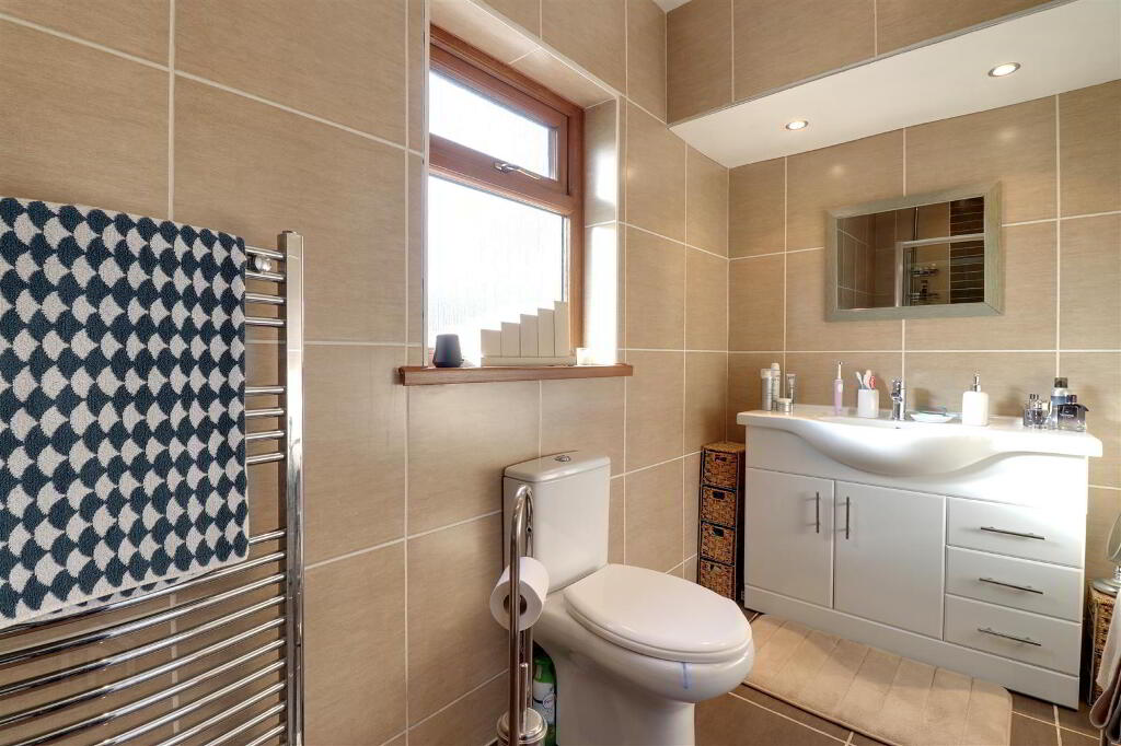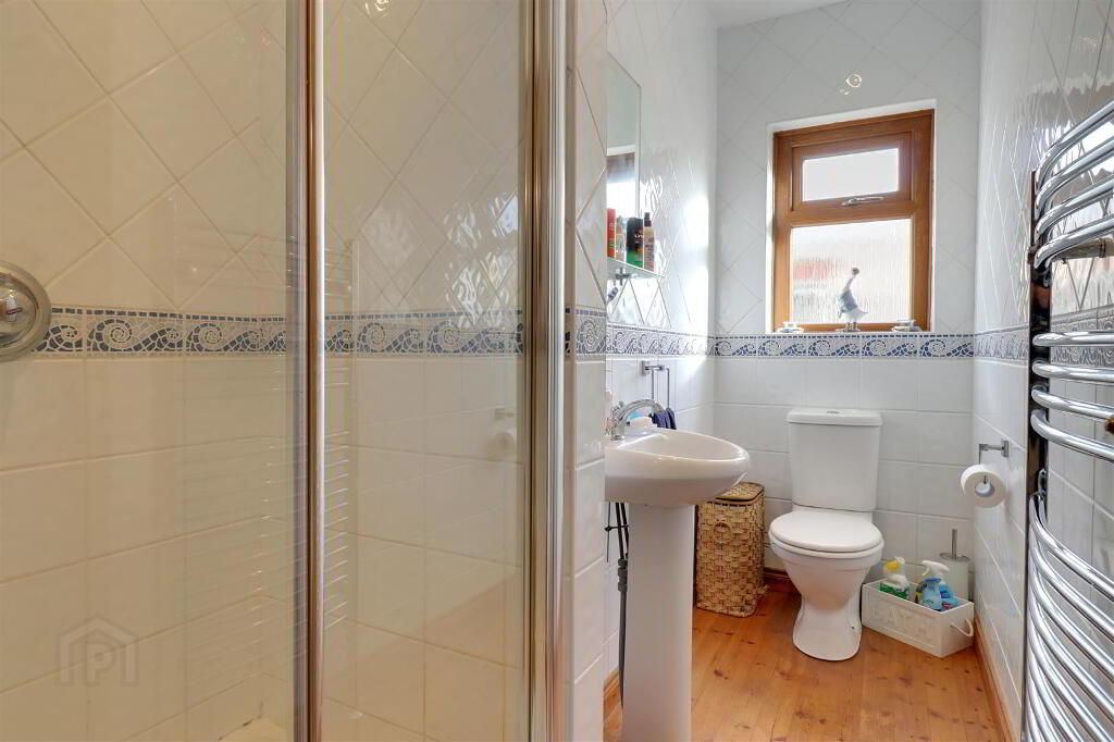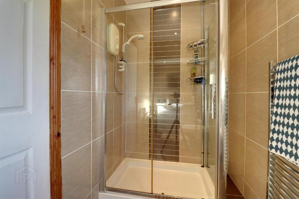 Double shower cubicle with electric shower. White WC & wash hand basin with vanity unit. Fully tiled walls and floor. Chrome heated towel rail.