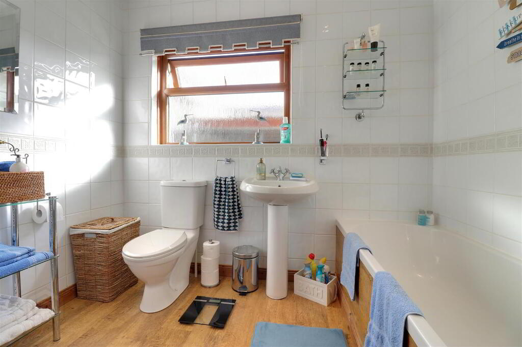 At widest points. White suite comprising panel bath, WC & wash hand basin. Tiled walls. Hot press. Recessed spotlights.