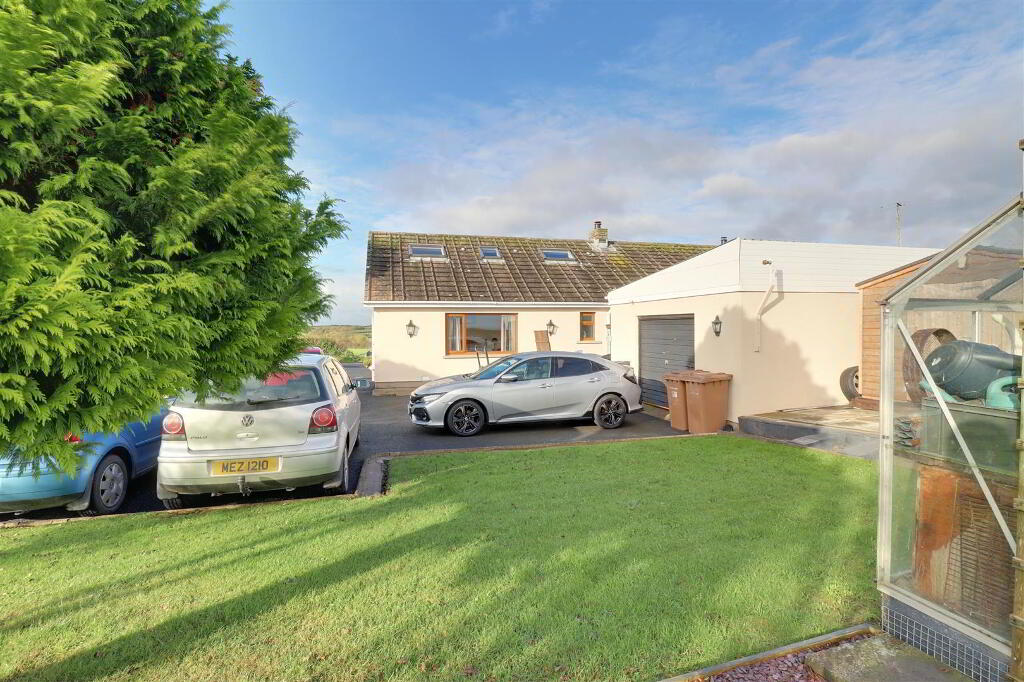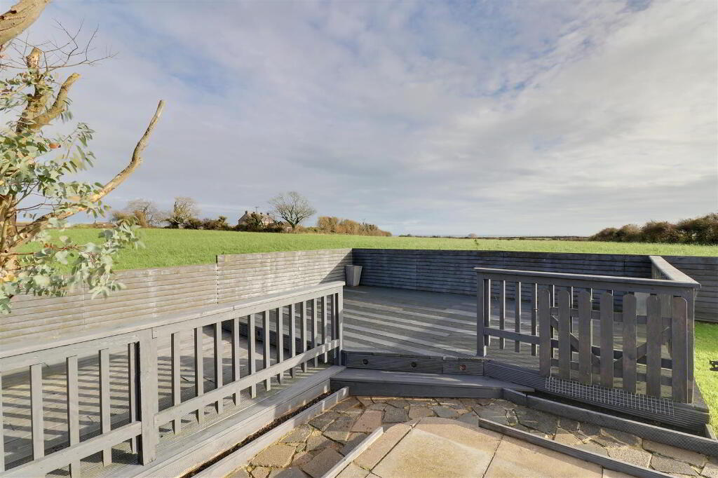 Gardens to front, side and rear extending to approx. 0.3 acres in lawn with tarmac driveway & parking area, paved patio area and raised deck with sea views. Light & tap.