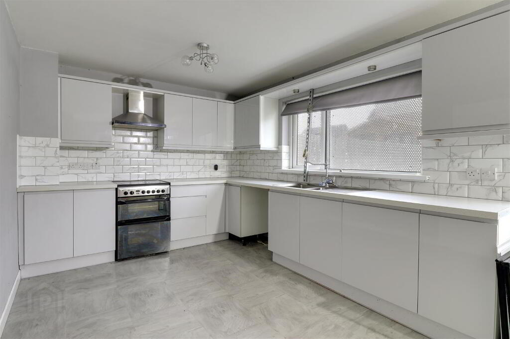 Range of high and low level units in gloss finish with marble effect worktops. 1 1/2 bowl stainless steel sink with mixer tap. Integrated oven, hob & extractor hood. Plumbed for dish washer. Under stairs storage cupboard.