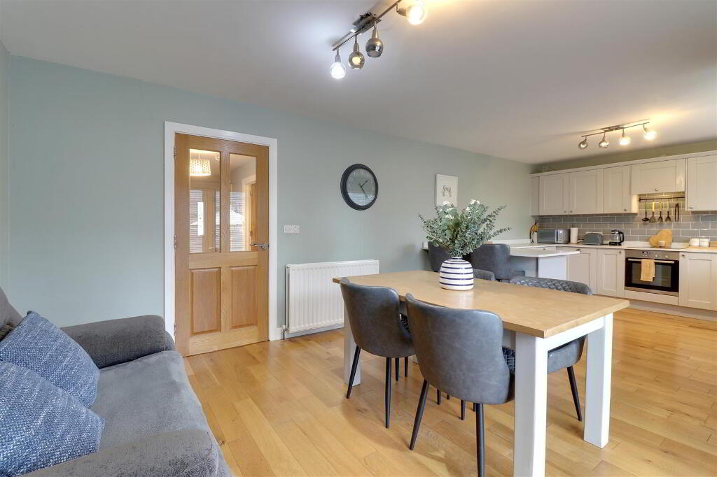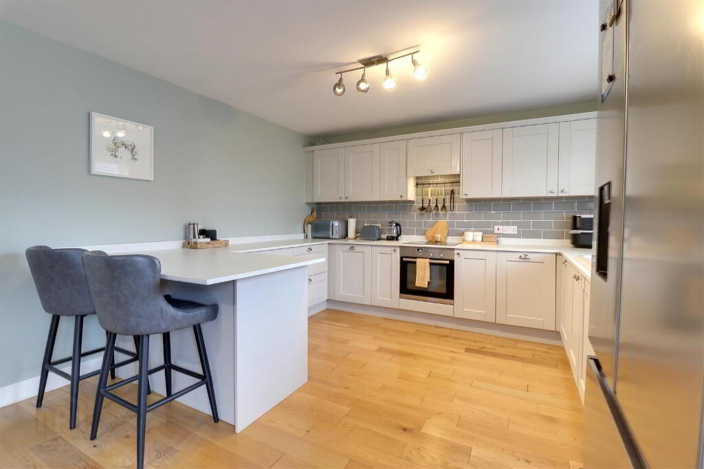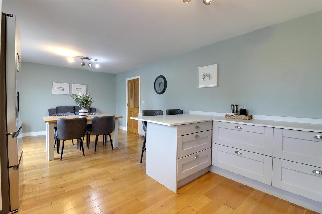 Real wood flooring. Range of high and low level units in grey "Shaker style" finish with marble effect worktops & breakfast bar. Composite sink with mixer tap. Integrated oven, hob & extractor hood. Integrated dish washer. Part tiled walls. uPVC double glazed patio doors to rear garden.