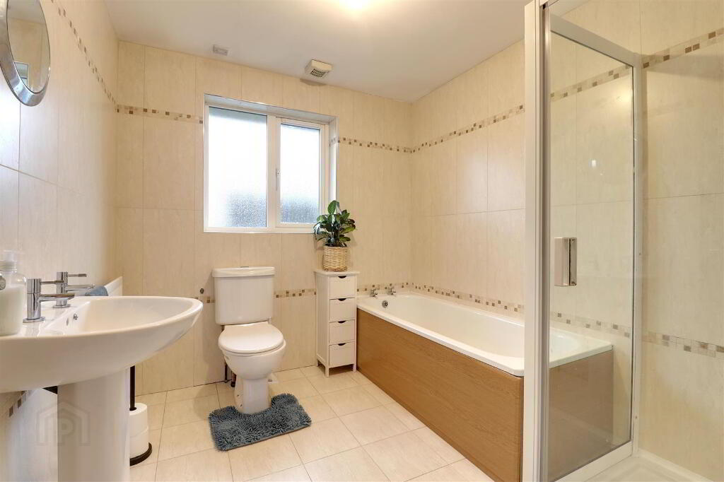 White suite comprising panel bath, WC & wash hand basin. Shower cubicle with Triton electric shower. Fully tiled walls and floor. Extractor fan.