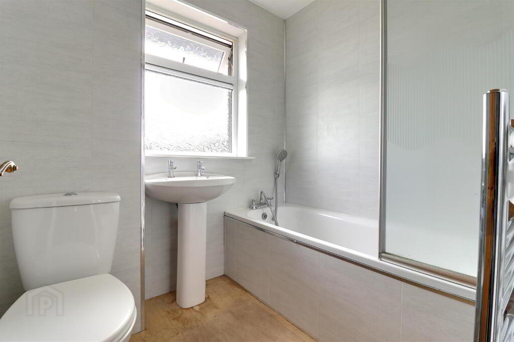 White suite comprising panel bath, with thermostatic shower and sliding glass shower screen, WC & wash hand basin. uPVC wall panelling. Chrome heated towel rail.