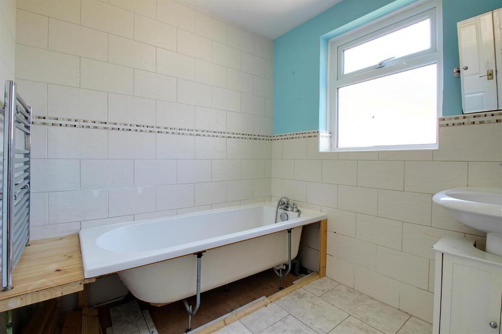 White suite comprising bath, WC & wash hand basin. Tiled shower cubicle with Triton electric shower. Tiled floor and part tiled walls. Chrome heated towel rail.
