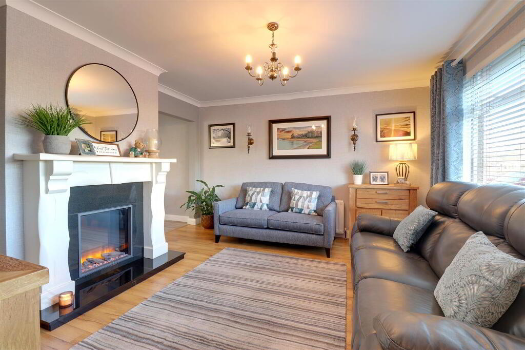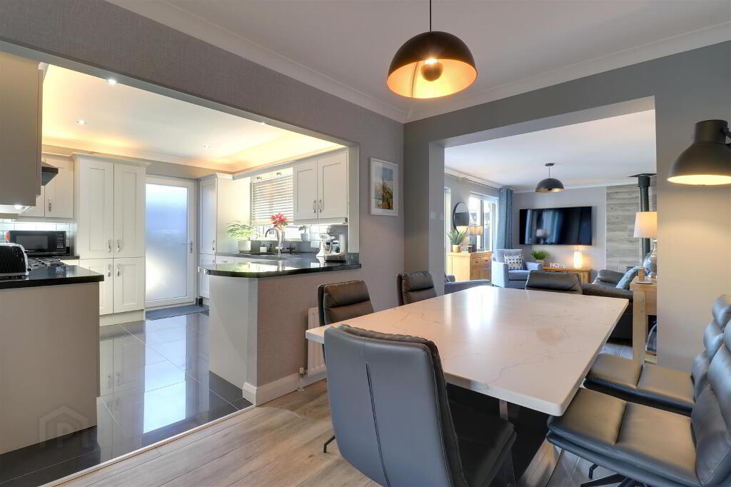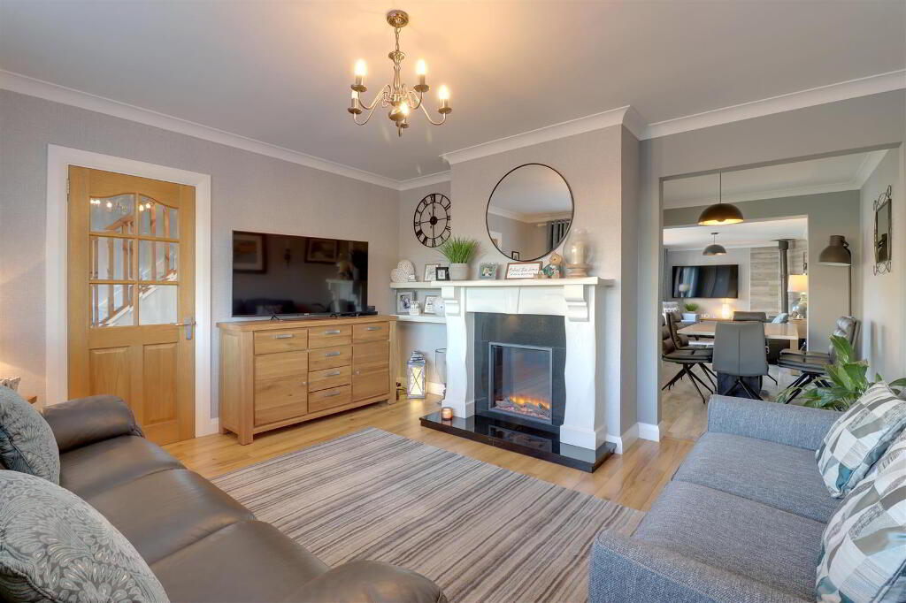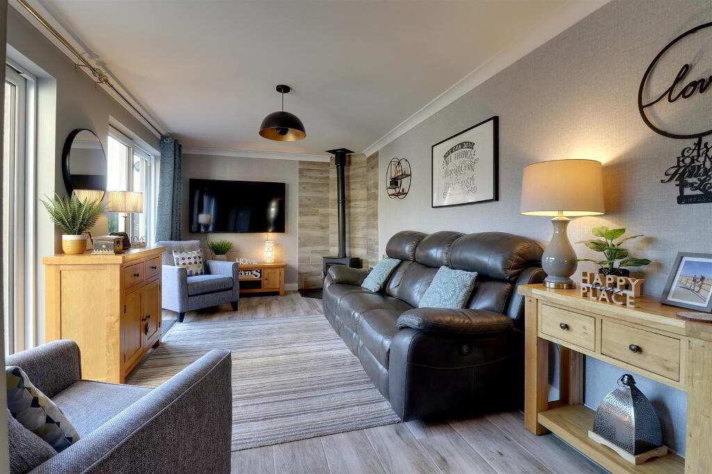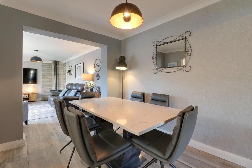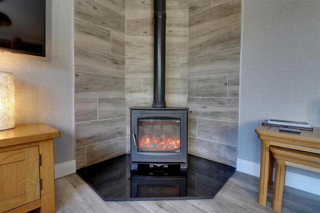 Wood effect tiled floor. Granite hearth with feature tiling and cast iron stove. Cornice ceiling. Twin uPVC double glazed sliding patio doors to rear garden. Feature wall radiator.