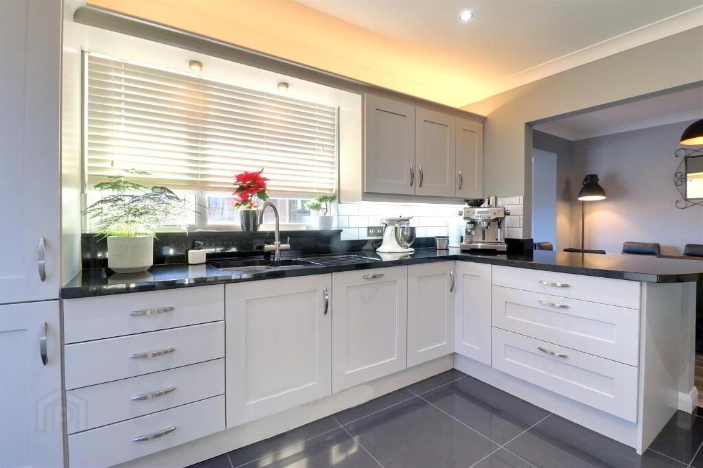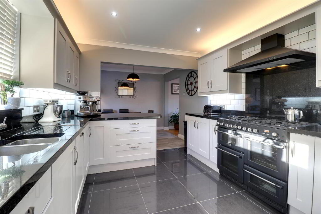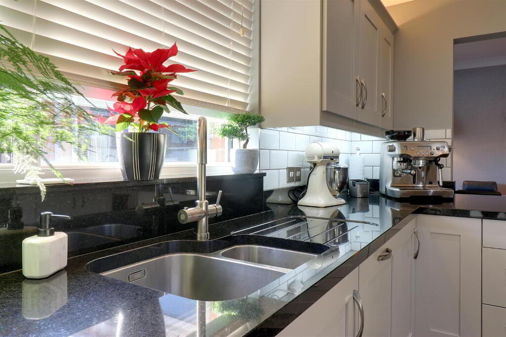 'Shaker style' kitchen units with granite worktop. 1 1/2 bowl stainless steel inset sink and 'Quooker' style kitchen tap. Integrated dishwasher and fridge freezer. Range style cooker with 6 ring gas hob and extractor hood. Gloss tiled floor. Part tiled walls. uPVC double glazed door to side garden. Cornice ceiling. Spotlights.