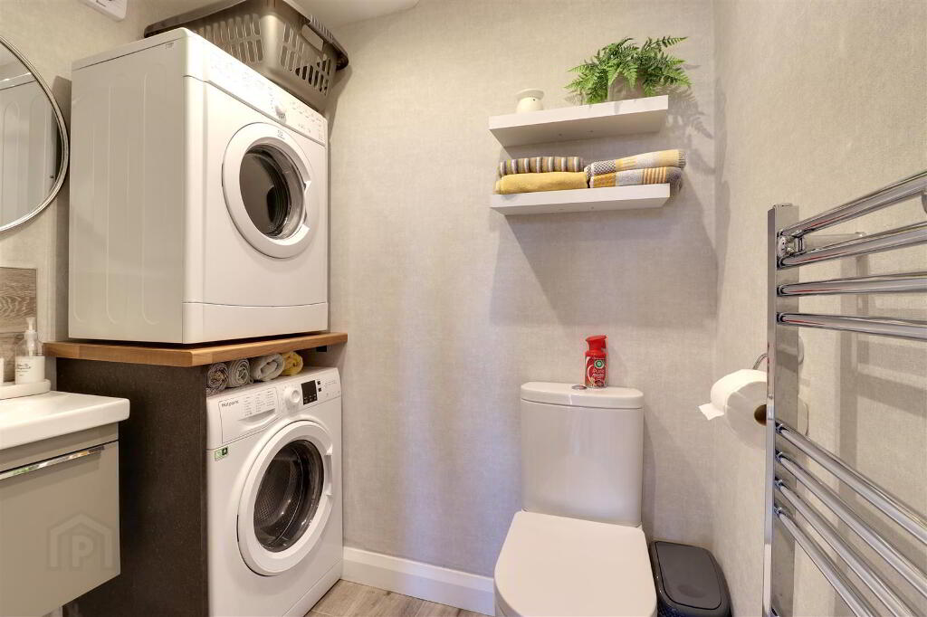 At widest points. White WC and wash hand basin with vanity unit. Plumbed for washing machine. Wood effect tiled floor. Chrome heated towel rail.