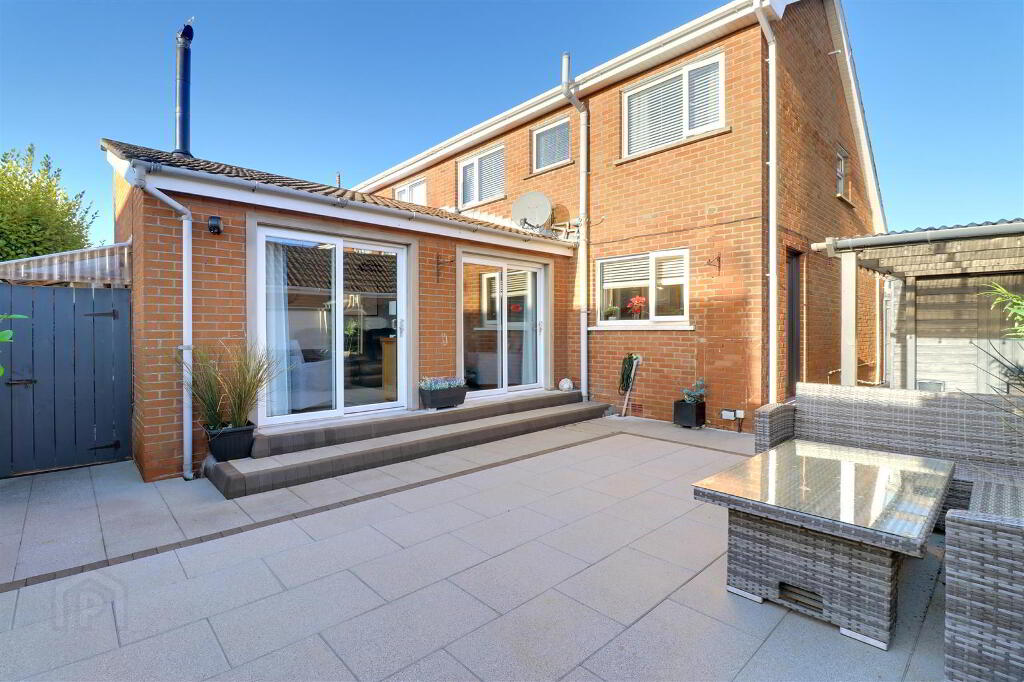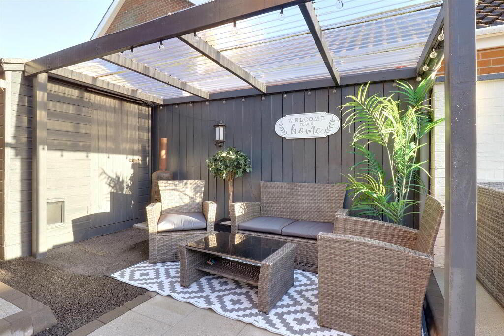 Fully tarmac driveway to front with garden laid in lawn. Landscaped patio to rear with lighting, outside tap and electric power point.