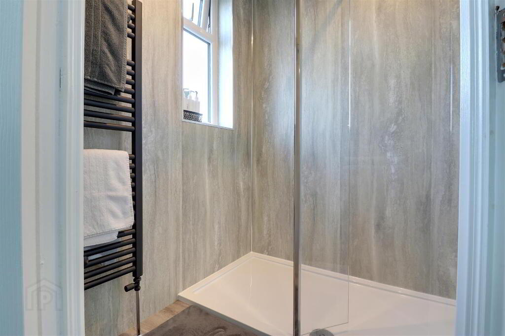 Thermostatic "Rain" shower with UPVC shower panels. Wood effect laminate floor. Heated towel rail. UPVC ceiling with spotlights.