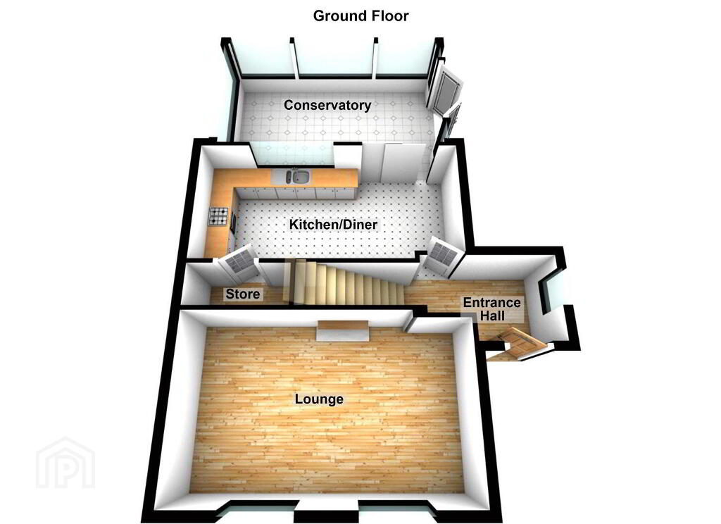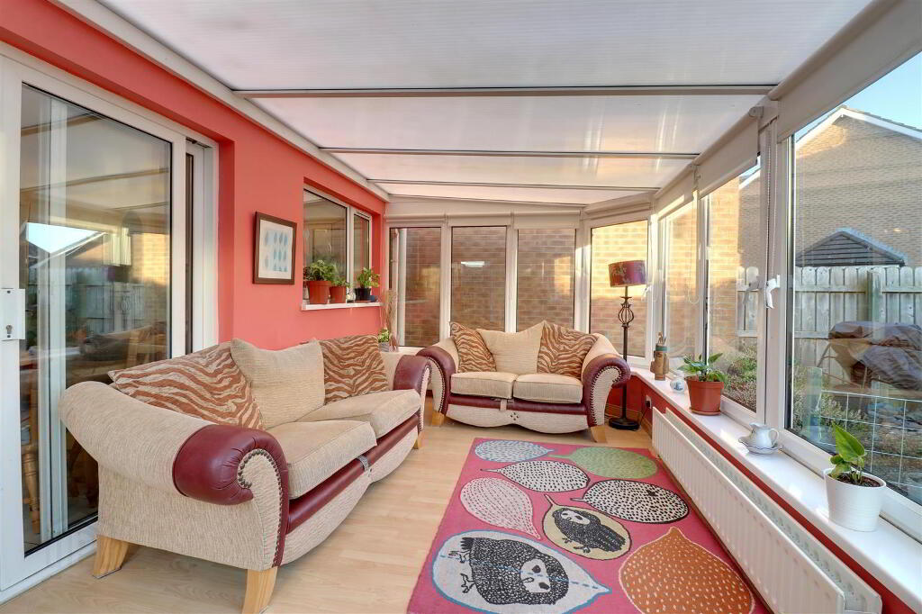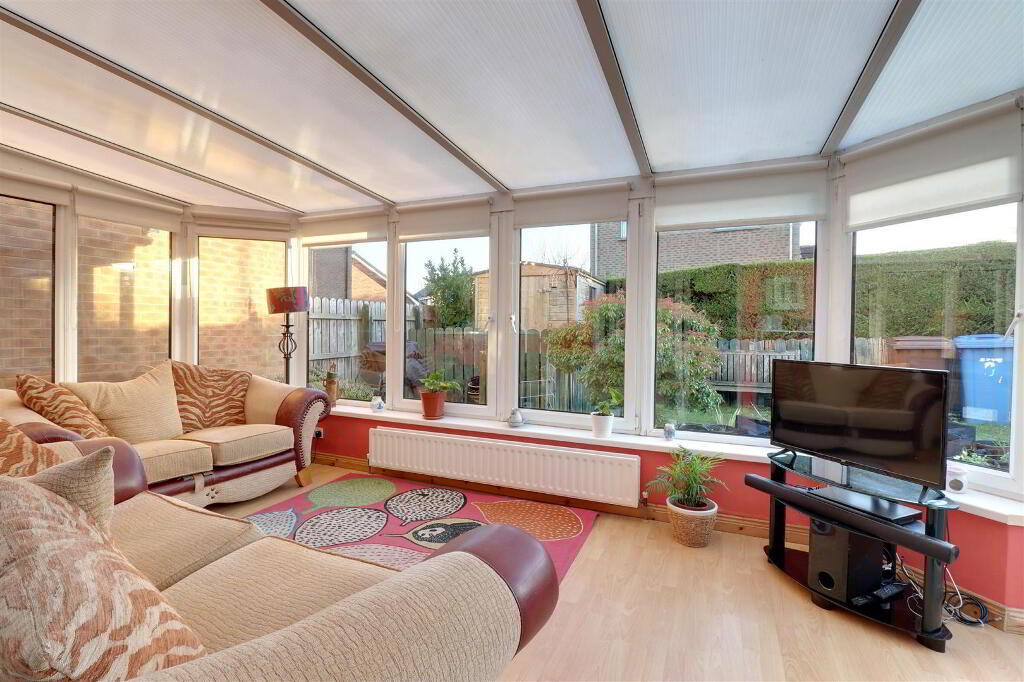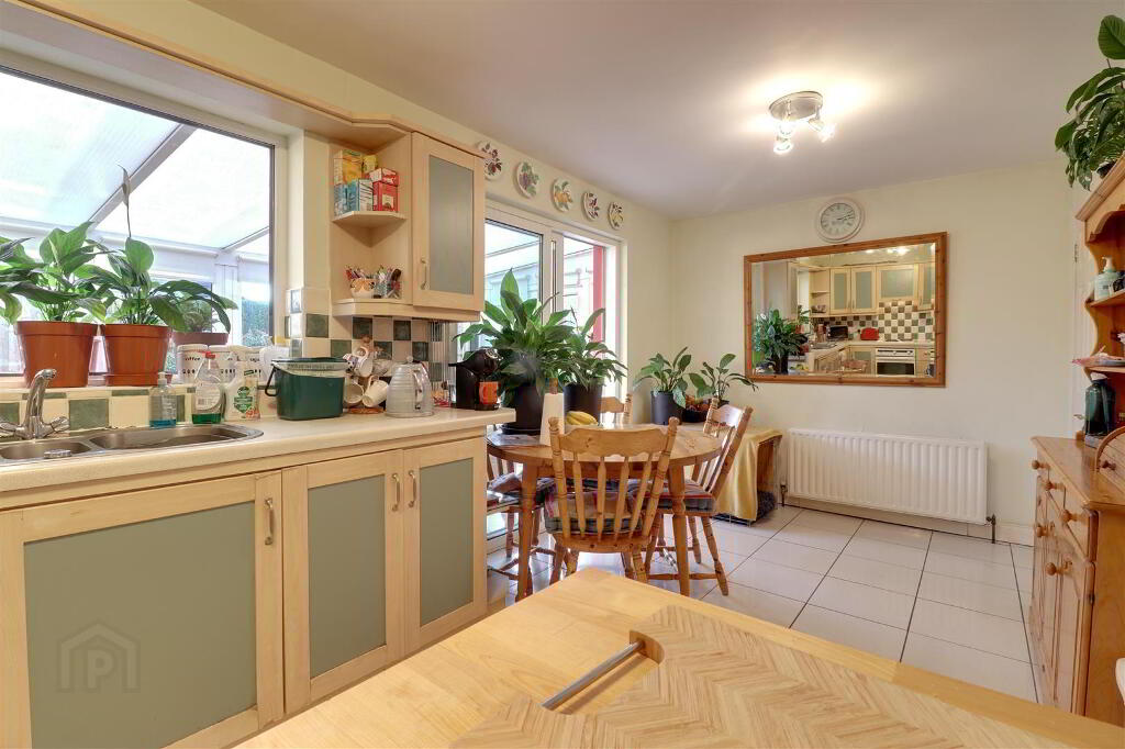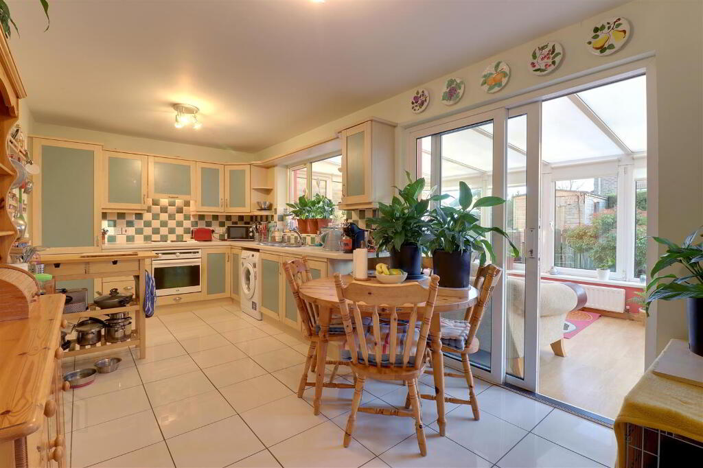 Range of high and low level units in two tone "Shaker style" finish with granite effect worktops. 1 1/2 bowl stainless steel sink with mixer tap. Integrated oven, hob & extractor hood. Integrated fridge freezer. Plumbed for washing machine. Tiled floor and part tiled walls. Under stairs storage cupboard. Sliding doubl eglazed patio doors to conservatory.