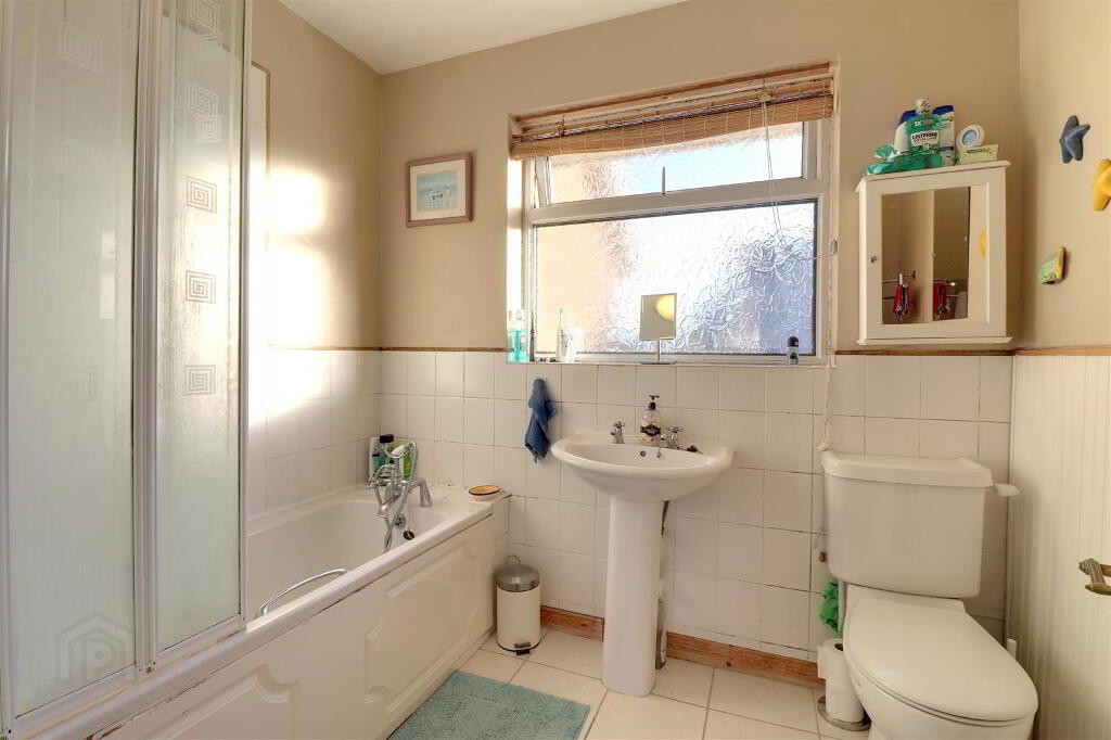 White suite comprising panel bath, with electric shower & folding shower screen, WC & wash hand basin. Tiled floor and part tiled walls. Part wood panelled walls.