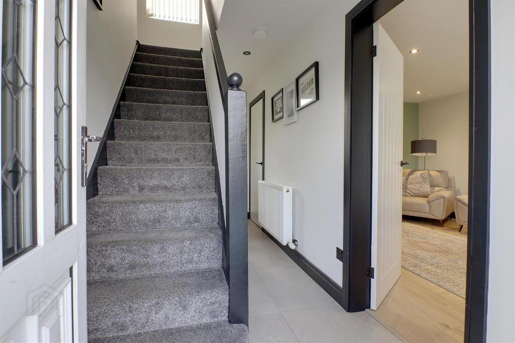 Tiled floor. Stairs to first floor landing. Storage cupboard. uPVC double glazed door to rear garden. Recessed spotlights.