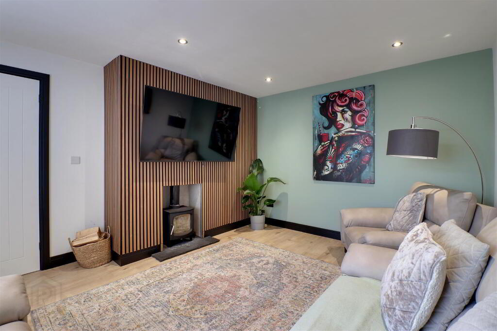 At widest points. Wood effect laminate flooring. Feature cast iron stove with slate hearth. Feature wall panelling. Feature wall radiator. Recessed spotlights.