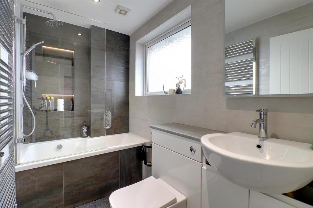 Modern white suite comprising "P" bath, with thermostatic "Rain shower" and glass shower screen, WC & wash hand basin with vanity unit. Tiled floor. Tile effect wall panelling. Chorme heated towel rail. Recessed spotlights. Extractor fan.