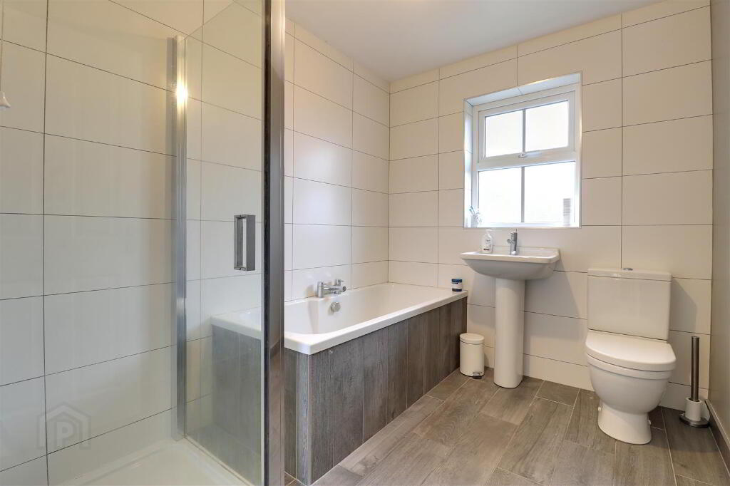 White suite comprising panelled bath, WC and wash hand basin. Shower cubicle with electric shower. Chrome heated towel rail. Tiled floor. Part tiles walls.