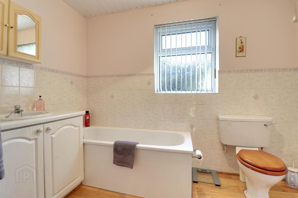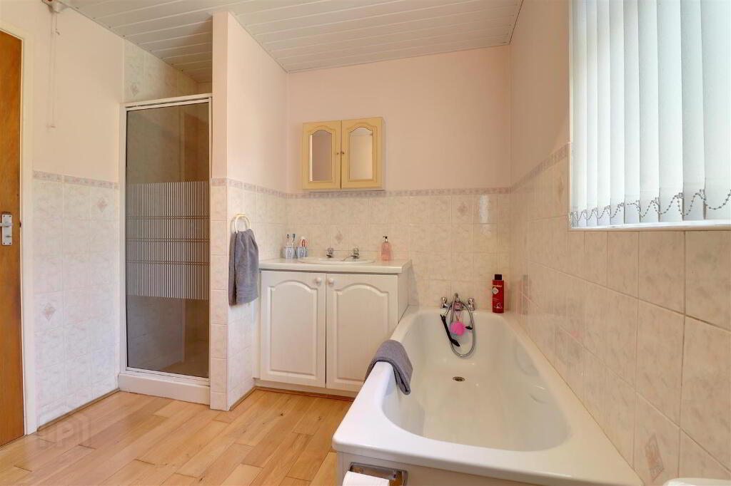 At widest points. White suite comprising bath, WC and wash hand basin with vanity unit. Tiled shower cubicle with electric shower. uPVC ceiling with extractor fan. Real wood floor. Part tiled walls.