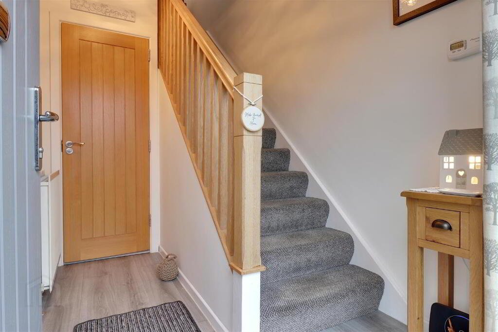 Stairs with oak banister leading to 1s floor. 1/2 glazed oak door to lounge.