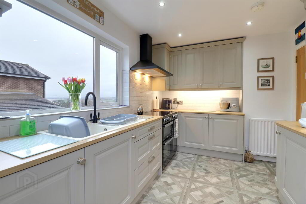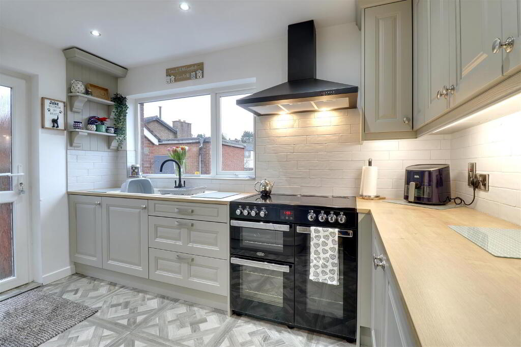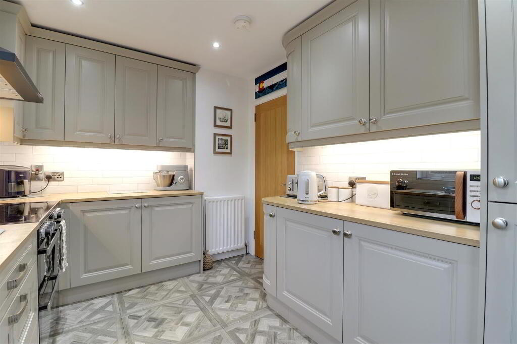 Modern fitted kitchen with wood effect work top. Under pelmet lighting. Composite sink. Integrated fridge freezer. Part tiled walls. Tiled floor. Recessed spotlights. uPVC double glazed door leading to rear garden.
