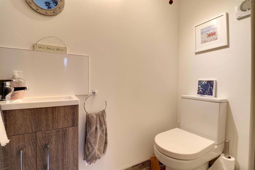 At widest points. White suite comprising WC and wash hand basin with vanity unit. Recessed spotlights. Extractor fan. Chrome towel rail.