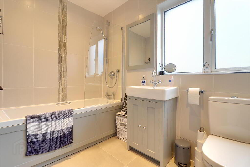 White suite comprising panel bath, with overhead thermostatic shower and glass shower screen, WC and wash hand basin with vanity unit. Fully tiled walls and floor. Recessed spotlights. Extractor fan. Feature radiator.