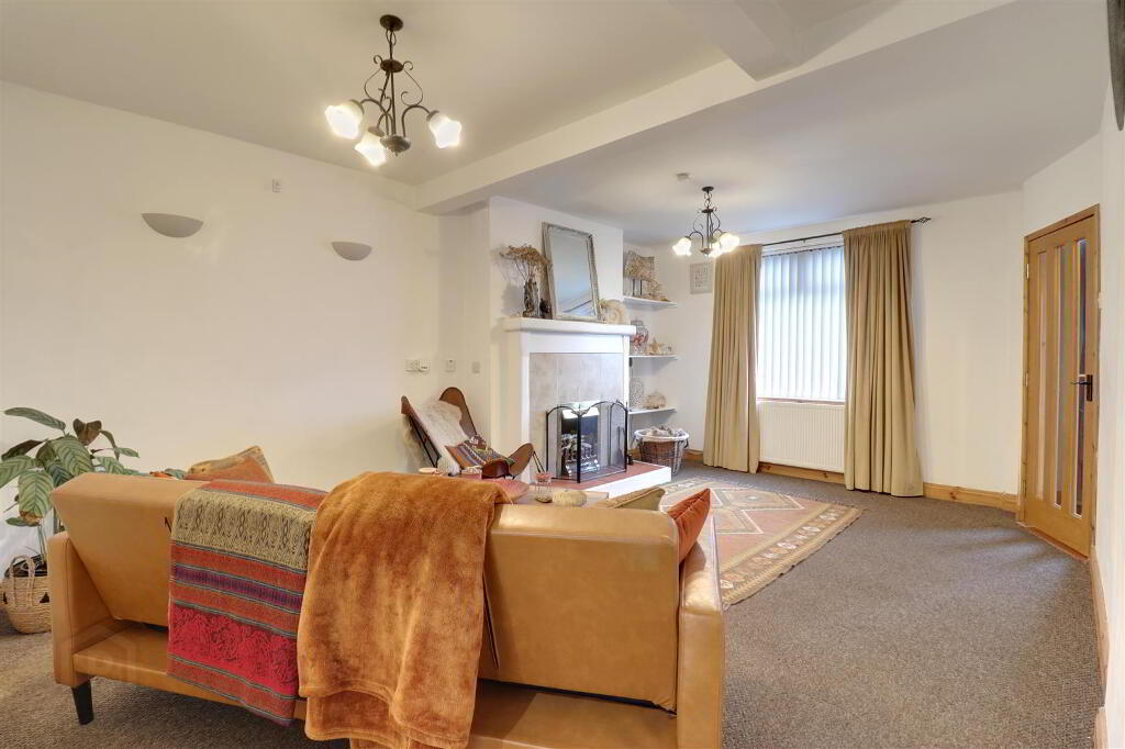 Feature tiled fireplace. Under stairs storage cupboard. Open to kitchen/diner.