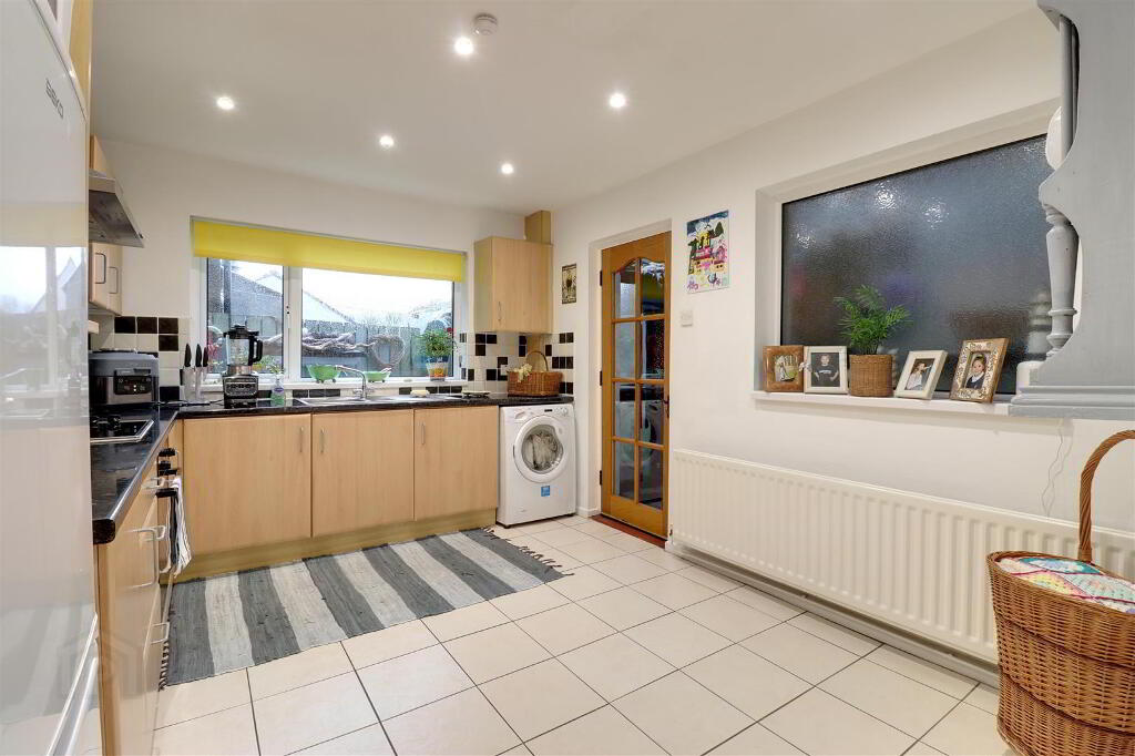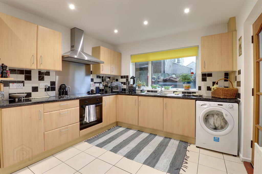 Range of high and low level units in beach effect finish with granite effect worktops. 1 1/2 bowl stainless steel sink with mixer tap. Integrated oven, hob & extractor hood. Plumbed for washing machine. Tiled floor & part tiled walls. Recessed spotlights. Access to covered area with oil fired boiler and access to small enclosed yard beyond.