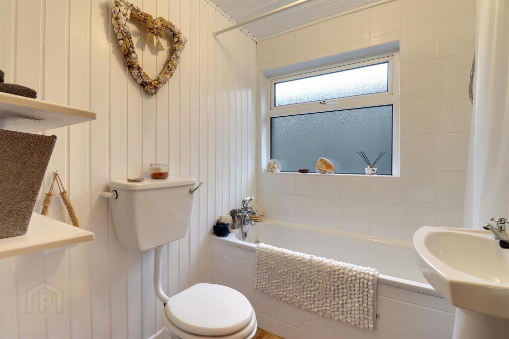 White suite comprising panel bath, with Triton Electric shower above, WC & wash hand basin. Wood panelling to walls and ceiling. Part tiled walls.
