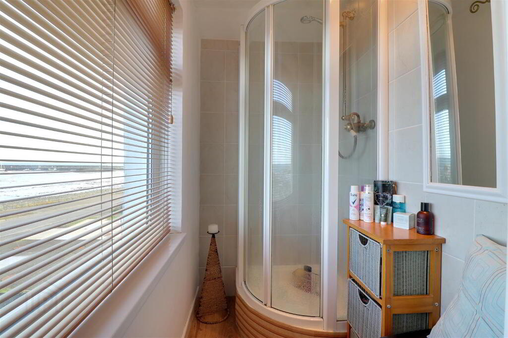 At widest points. Wood effect laminate floor. Corner shower with part tiled walls. Sea views.