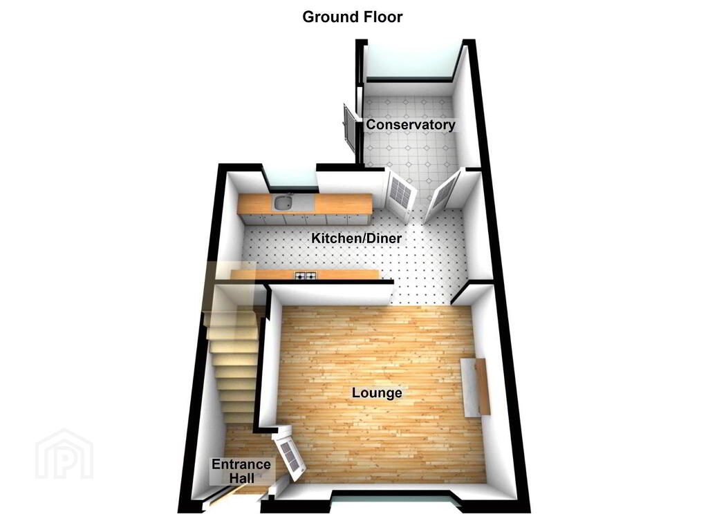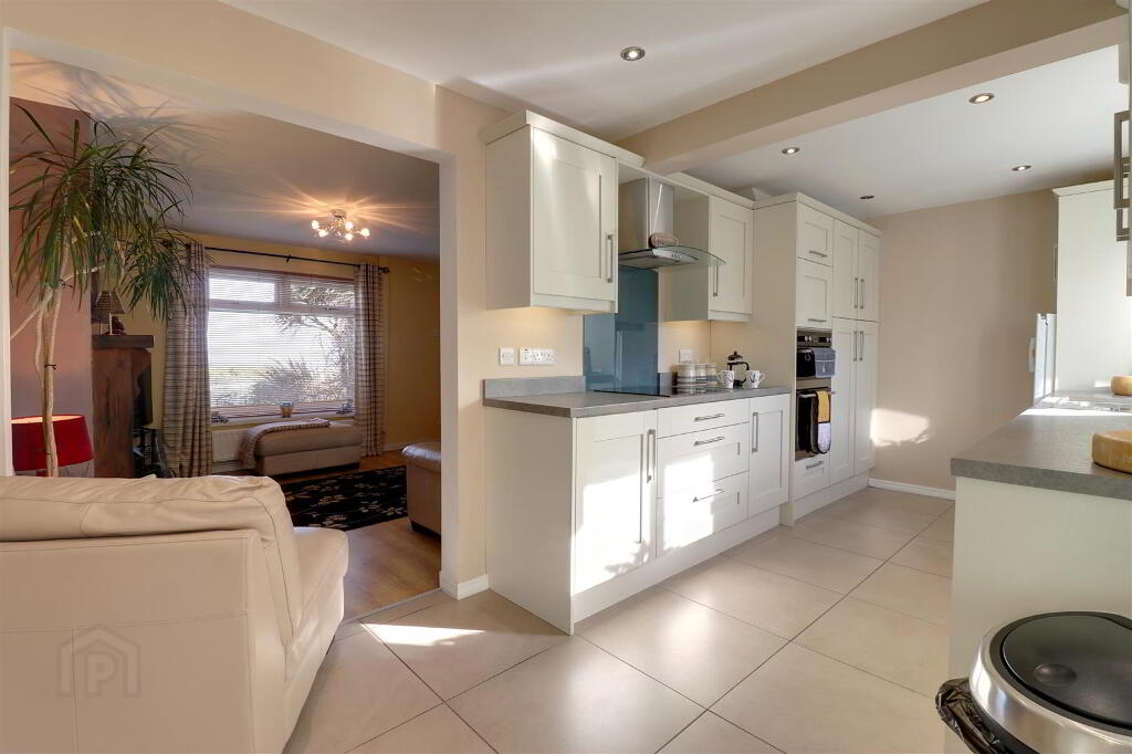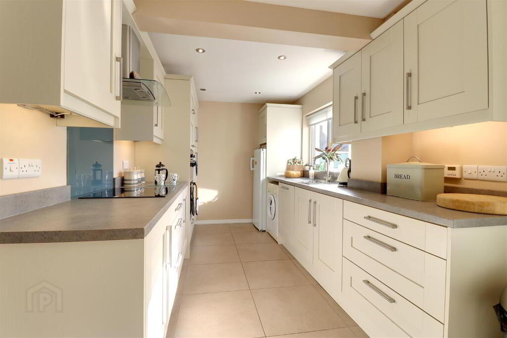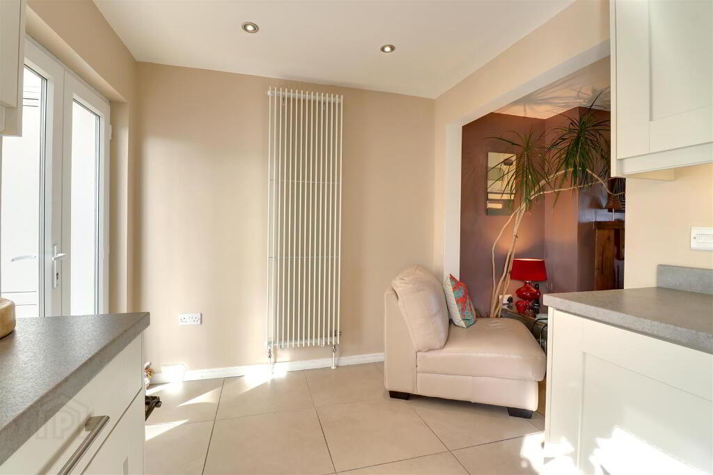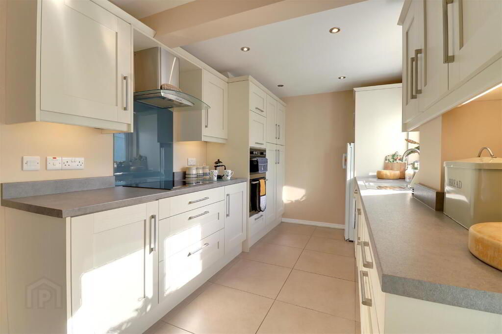 Shaker style kitchen units with stone effect worktop. Stainless steel sink. Integrated oven, hob & extractor fan with glass splash back. Plumbed for washing machine. Recessed spotlights. Tiled floor. Feature wall radiator. uPVC double glazed patio doors to conservatory. Open to lounge.