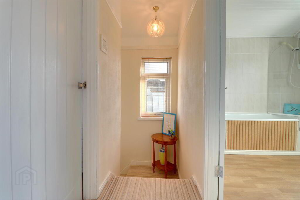 White suite comprising panel bath with electric shower and glass screen, WC and wash hand basin. Part tiled walls. Tongue and groove ceiling. Radiator. Access to hot press.