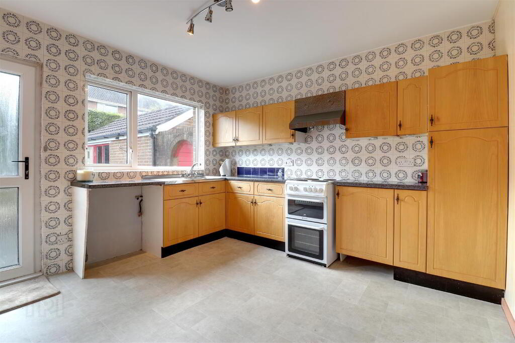 Range of Oak high and low level units with granite effect worktop. Stainless steel sink. Stainless steel Extractor hood. Plumbed for washing machine. Part tiled walls. Part paneled walls. 1/2 glazed door to entrance hall. uPVC double glazed door to rear garden.