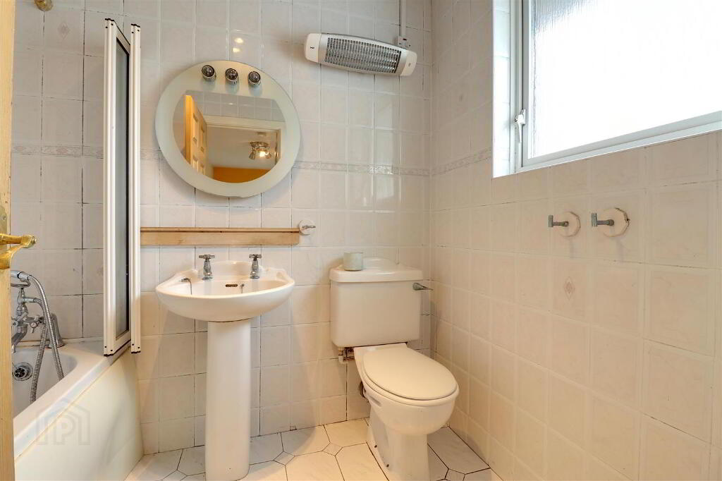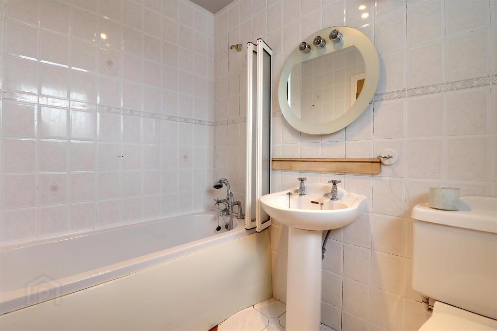 White suite comprising panel bath, WC and wash hand basin. Fully tiled.