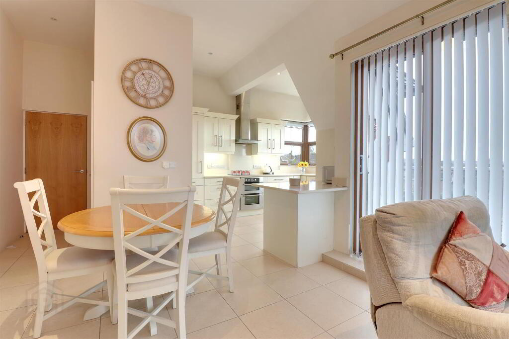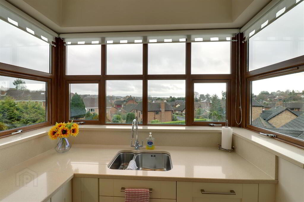 'Shaker' styler kitchen cabinets with granite work top and breakfast bar. 11/2 stainless steel sink with mixer taps. Integrated oven, hob and extractor fan. Integrated dishwasher. Integrated fridge freezer. Tiled floor. Recessed spotlights. Views.