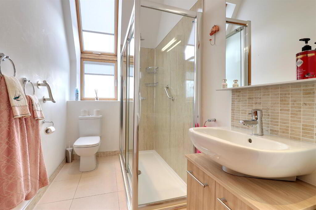 White suite comprising WC and wash hand basin. Double shower cubicle with thermostatic 'Rain' shower. Aqua paneling. Chrome towel rail. Recessed spotlights. built in ceiling speakers.