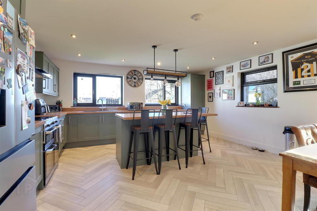 'Shaker' style kitchen cabinets with wood effect work top. Central Island with feature lighting and wine fridge. Composite sink. Integrated dishwasher. Plumbed for washing machine. 'Parquet' style floor. Recessed spotlights. Composite door leading to driveway.