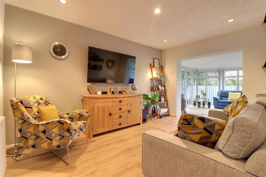 Bay window. Gas fire with granite hearth. Wood effect laminate floor. Wall lights. Cornice ceiling. Glazed French doors to dining area. Glazed door to entrance hall.