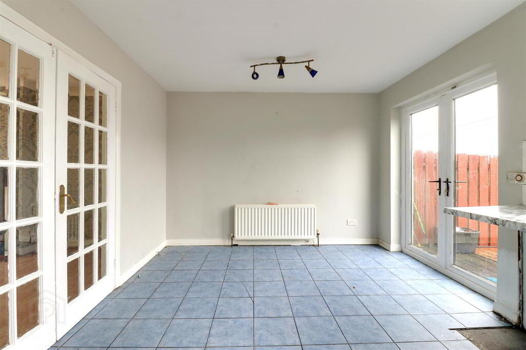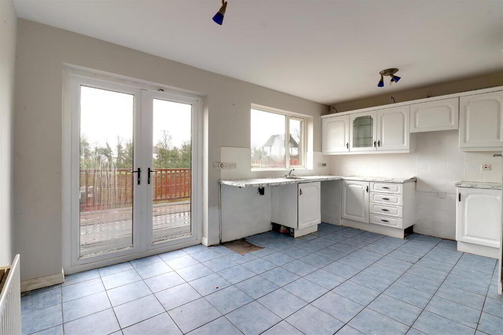 Basic fitted kitchen (requires replacement). Stainless steel sink. Tiled floor and part tiled walls. uPVC double glazed patio doors to rear garden.
