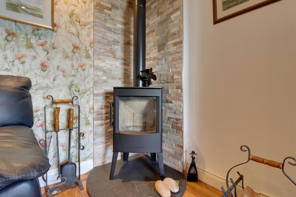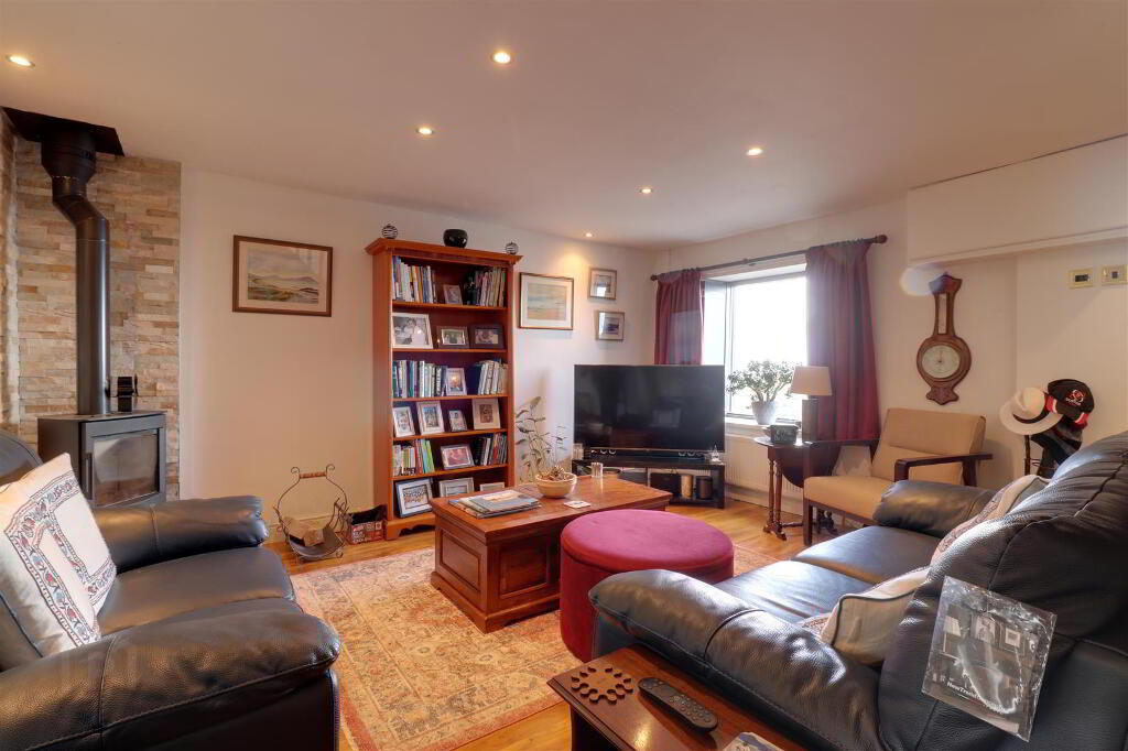 Tiled entrance plus laminate wood flooring to main area. Oak spindle stair case to first floor. Feature cast iron wood burner with slate hearth. Recessed spotlights. Sea views.