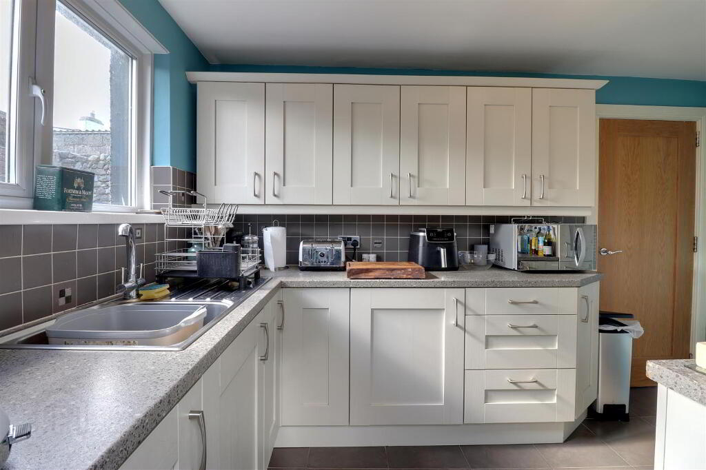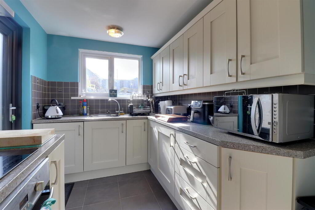 Range of modern high and low level units in Shaker style with stone effect worktops. Stainless steel sink with mixer tap. Integrated oven, hob & extractor hood. Integrated fridge freezer and washing machine. Tiled floor and part tiled walls. Composite door to rear garden. Feature wall radiator.