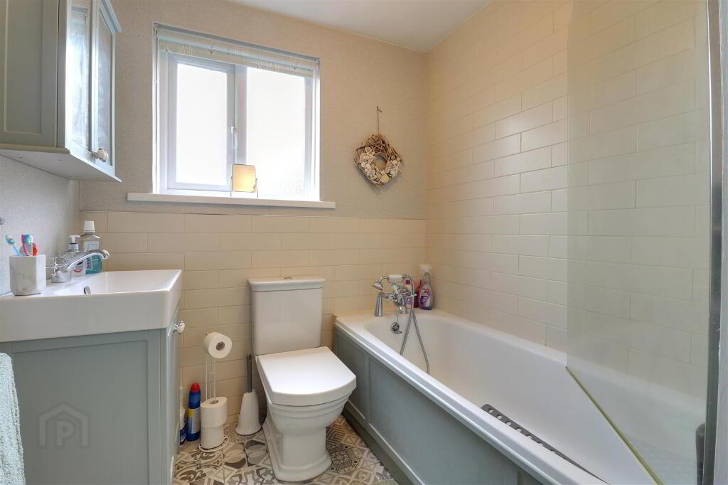 Modern white suite comprising panel bath, with glass shower screen and Triton electric shower above, WC & wash hand basin with vanity unit. Tiled floor and part tiled walls. Feature radiator & towel rail. Hot press.